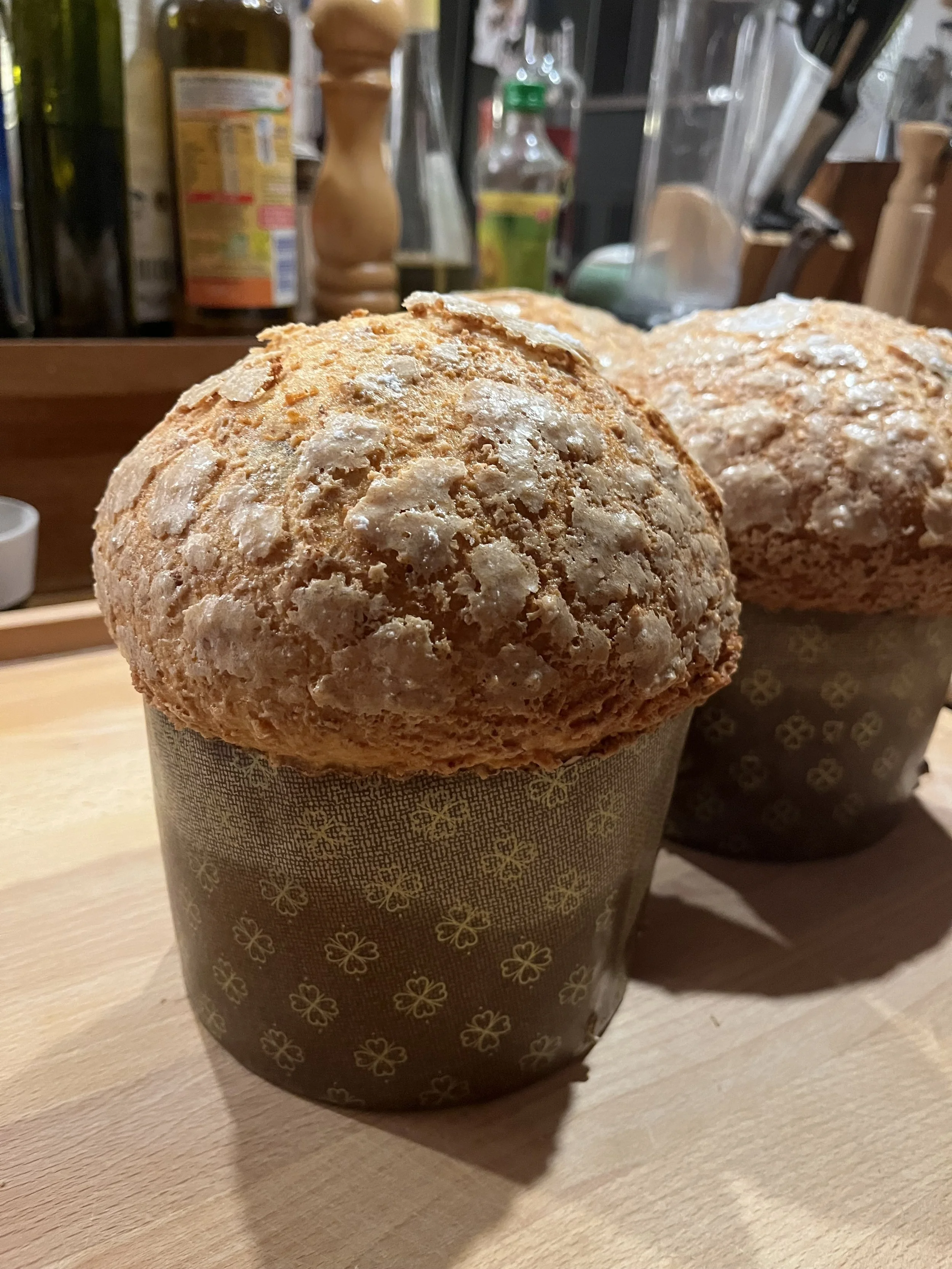 Anschließend wird er mit Mandel-/Zuckerguß bei niedriger Temperatur in einer Papierform gebacken und – wie in bester italienischer Tradition – kopfüber aufgehängt, damit seine luftige Krume perfekt erhalten bleibt - der Kopf wäre sonst für den Körper zu schwer.